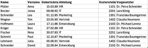 Schau dir die Demo-Mitarbeiterdaten in der Tabelle an und merke dir Name, Vorname und Geburt